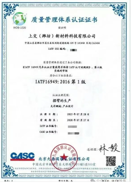 上交(潍坊)新材料公司成功取得IATF16949质量管理体系认证证书